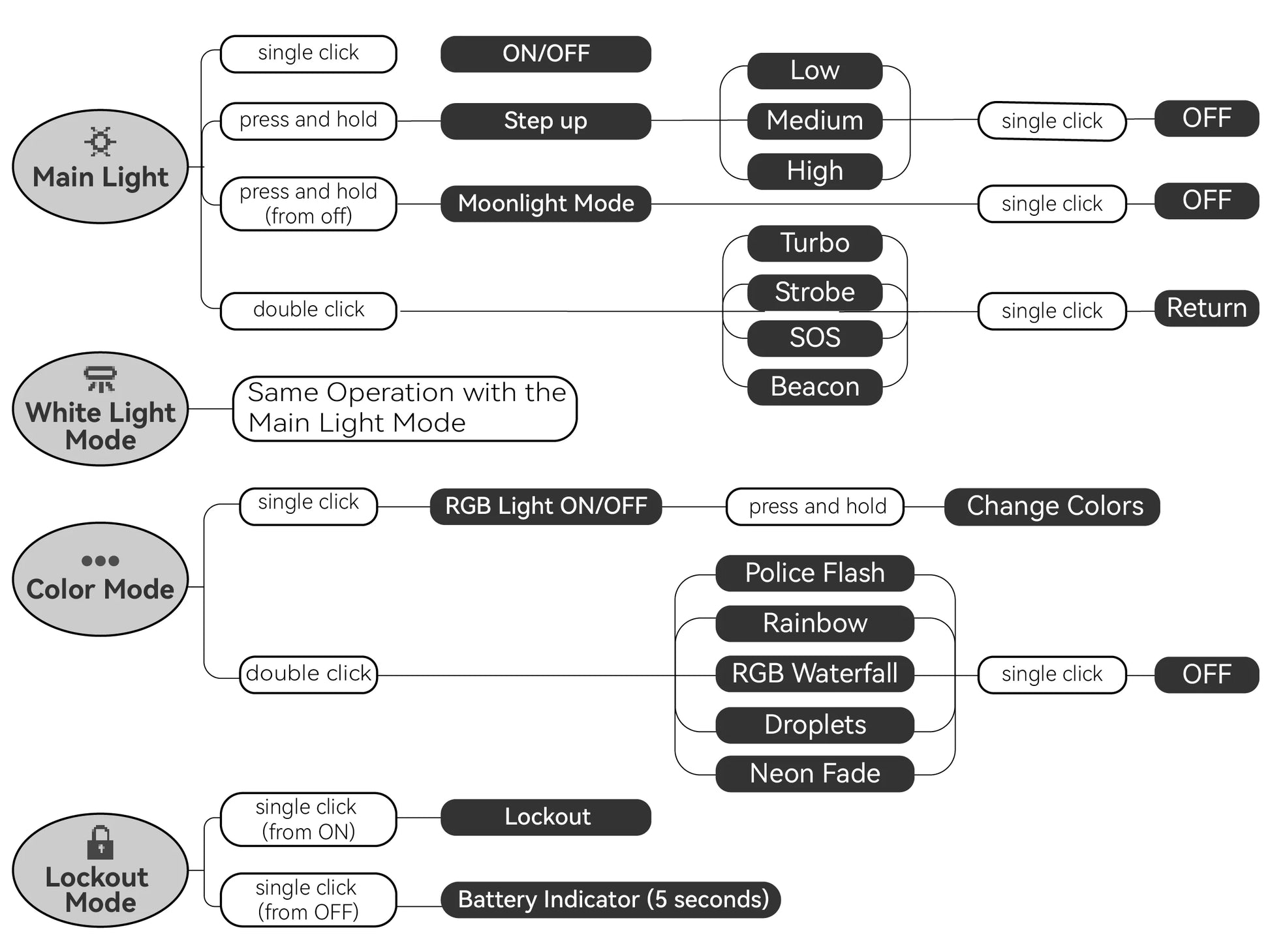 DIRECT ACCESS TO SPECIAL MODES (Turbo/Strobe/SOS/Beacon): Fast double-click the switch and it cycles through: Turbo→Strobe→SOS→Beacon.