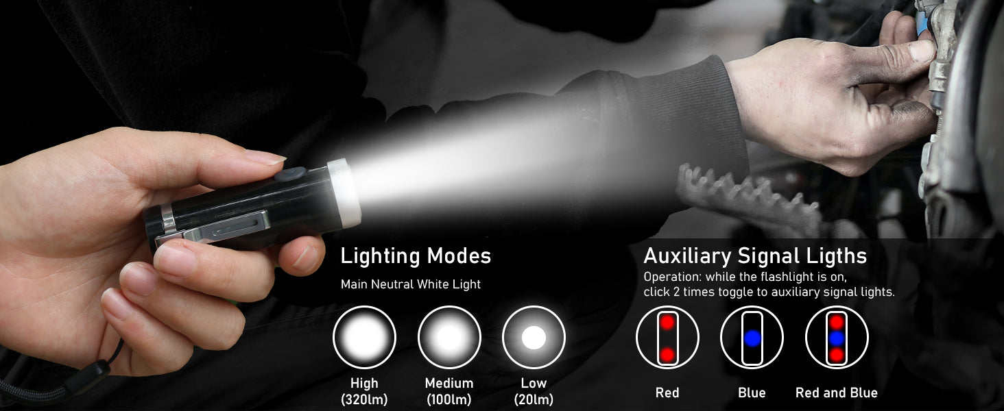3. Dual-Light Functionality: This flashlight features both front white light and strobe sidelight, giving you the option to switch between a bright focused beam and a flashing signal mode.