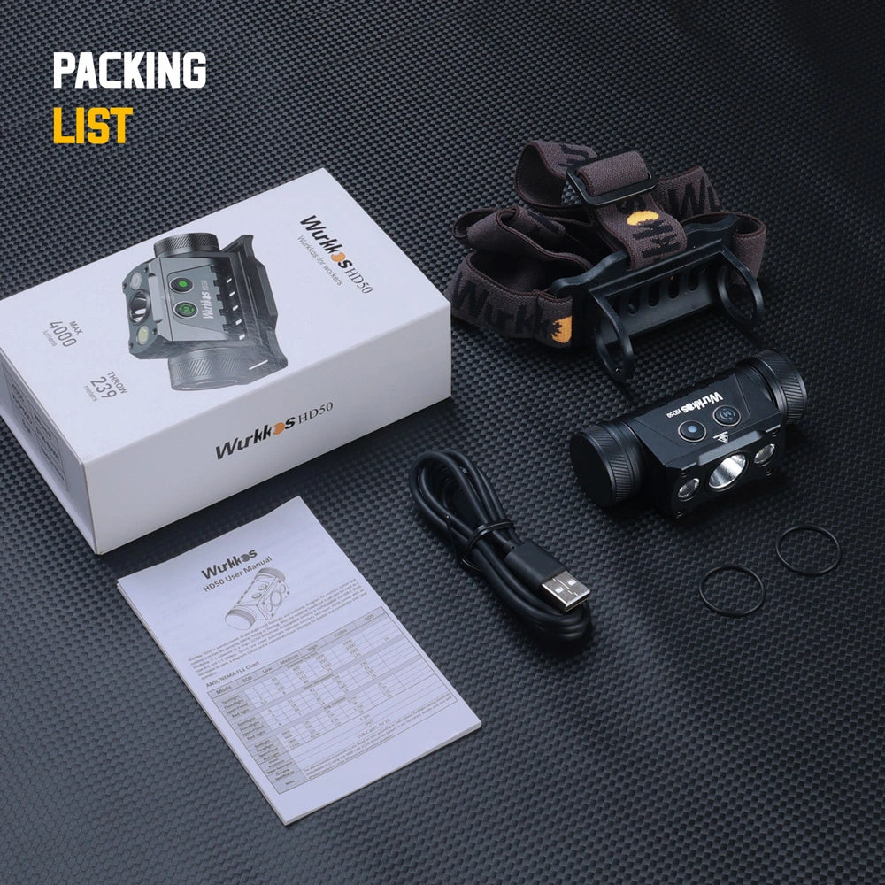 Wurkkos HD50 with Spotlight & Floodlight & red light, 4000LM/ 239M Magnetic Tailcap USB-C dual switch - Battery Inc