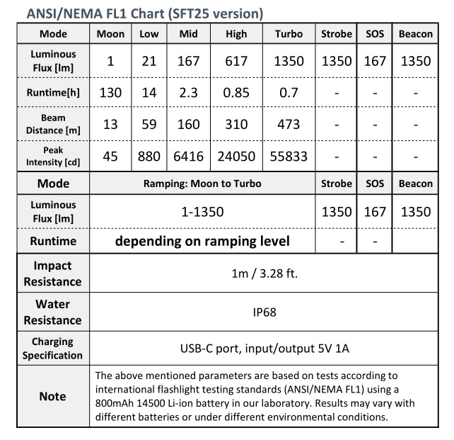 The TS12 features the advanced SFT-25R LED, providing 1350 lumens of brightness and a range of up to 473 meters. This brightness is sufficient to illuminate a large yard, a vast campsite, or provide clear visibility over long distances on dark roads. The internal 14500 battery with 900mAh ensures stable illumination, making it ideal for long-distance lighting or outdoor exploration in various environments.